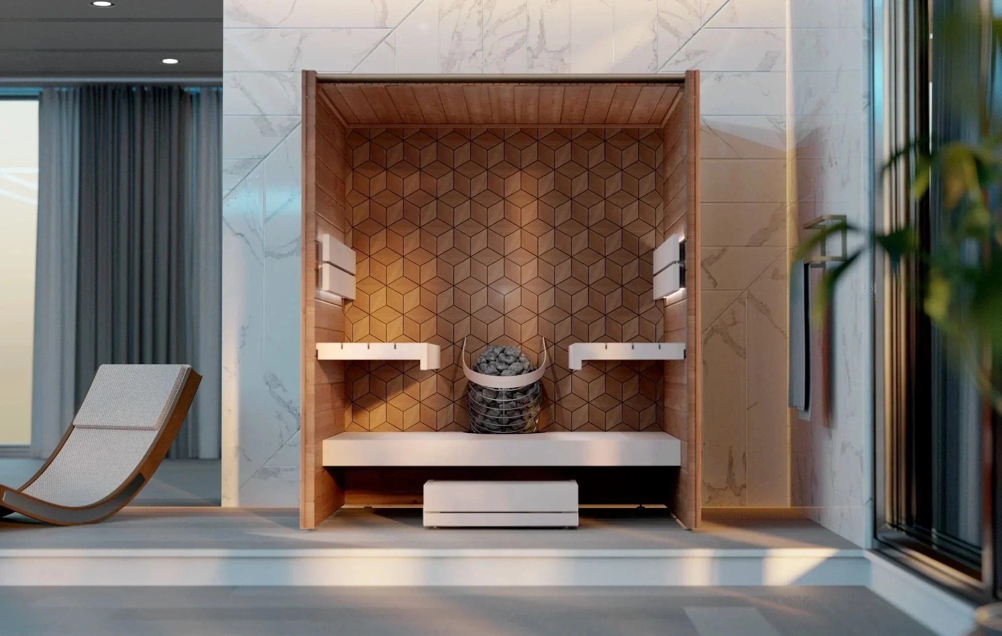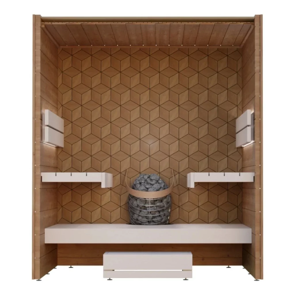 • Superior Bench Configuration: Designed with a step-up to two raised benches, the heater is built into the step. This ensures that heat circulates effectively from the floor up, providing a balanced temperature throughout the entire social space.