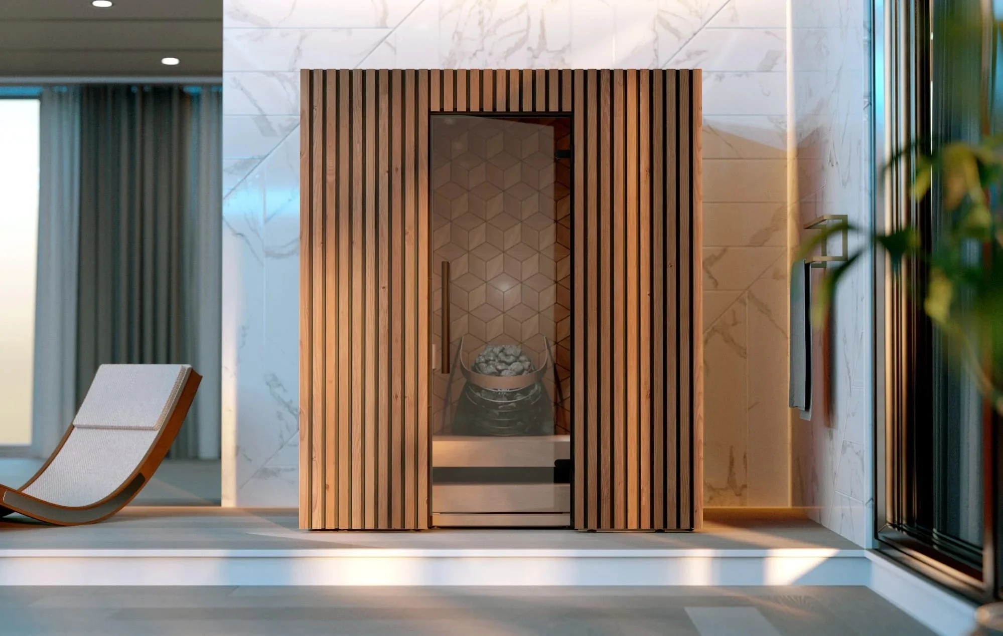• 40mm Nordic ThermoWood: This 40mm thermally modified timber is exceptionally resistant to humidity and resin leaks, ensuring the sauna remains structurally perfect for years.