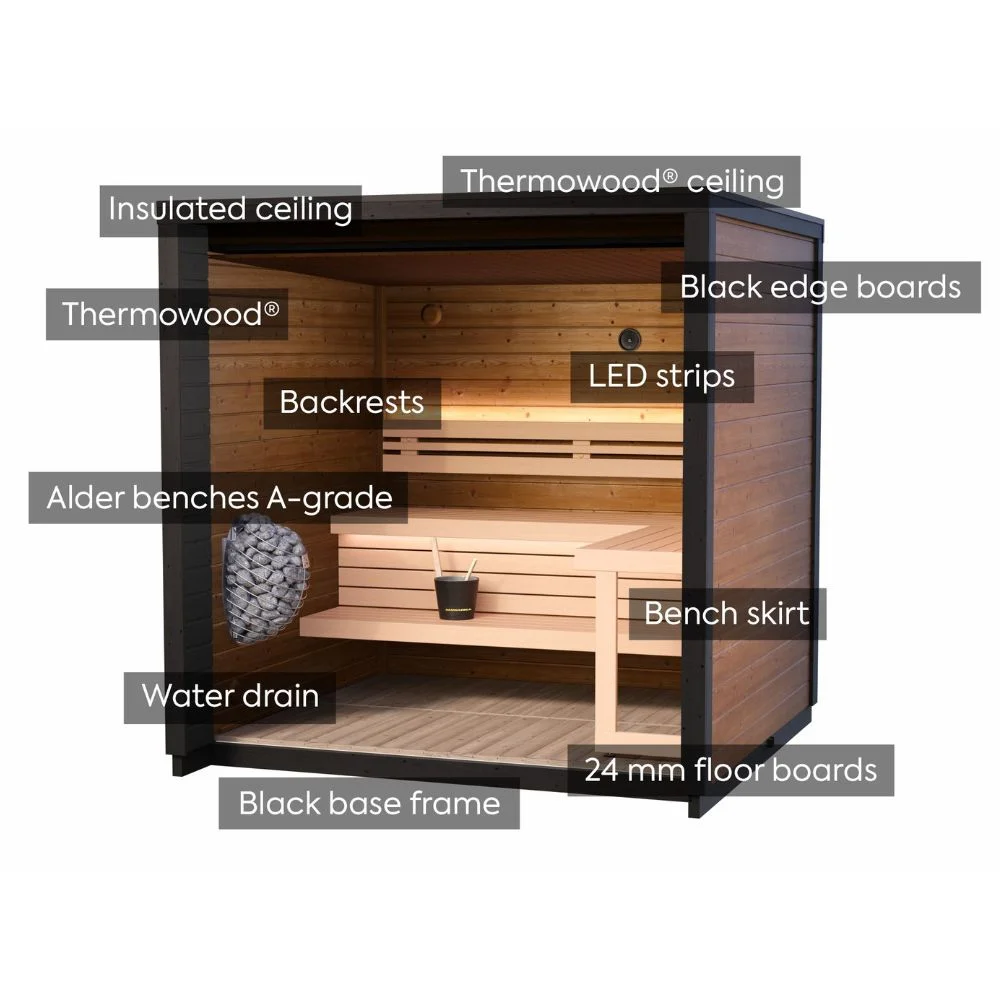 • 40mm Thermowood Walls: The Patio XS is built with 40mm thick thermally modified timber. This modification makes the wood exceptionally stable and resistant to humidity, so it will not swell, shrink, or leak resin over time.