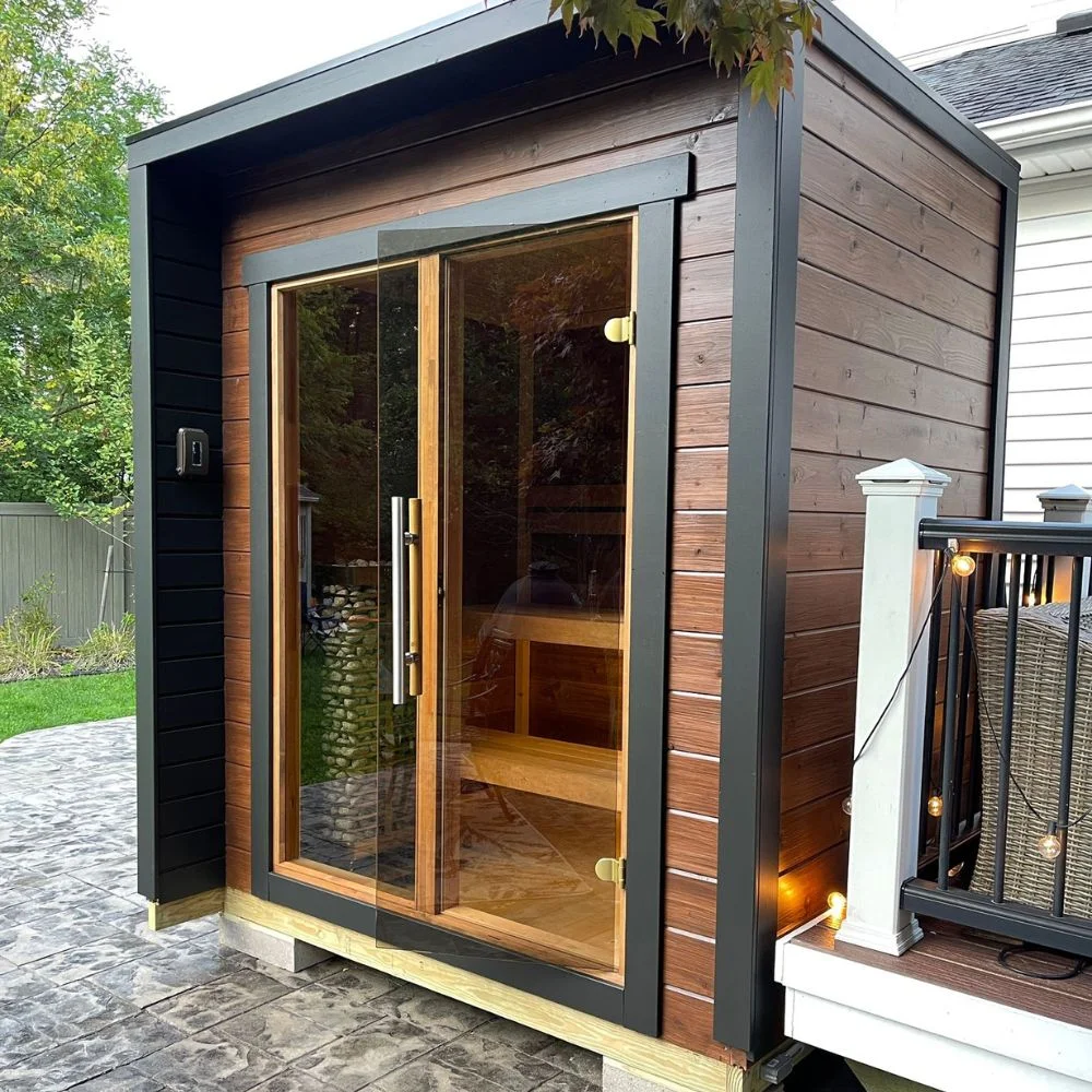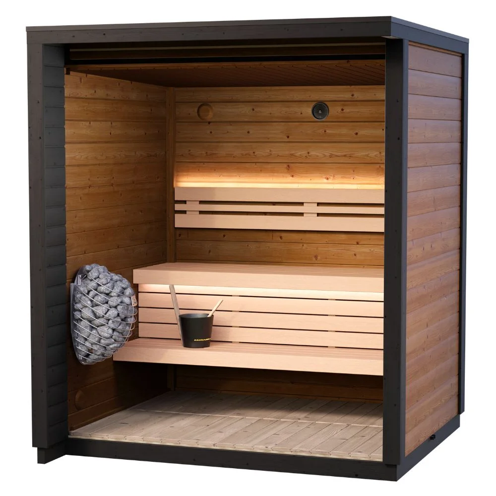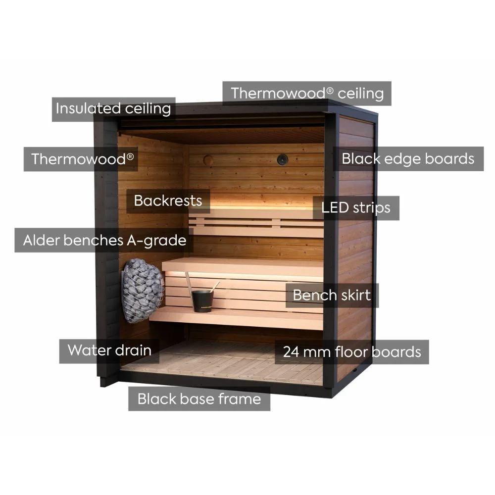 The Patio XXS is a clever solution for those who want the authentic outdoor sauna experience but have a bit less room to play with in the garden. It comfortably fits up to three people in a one-room layout that is all about efficiency without losing that premium feel.
