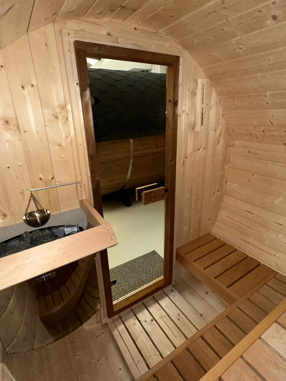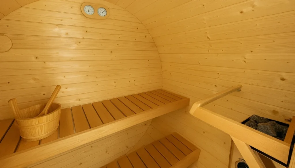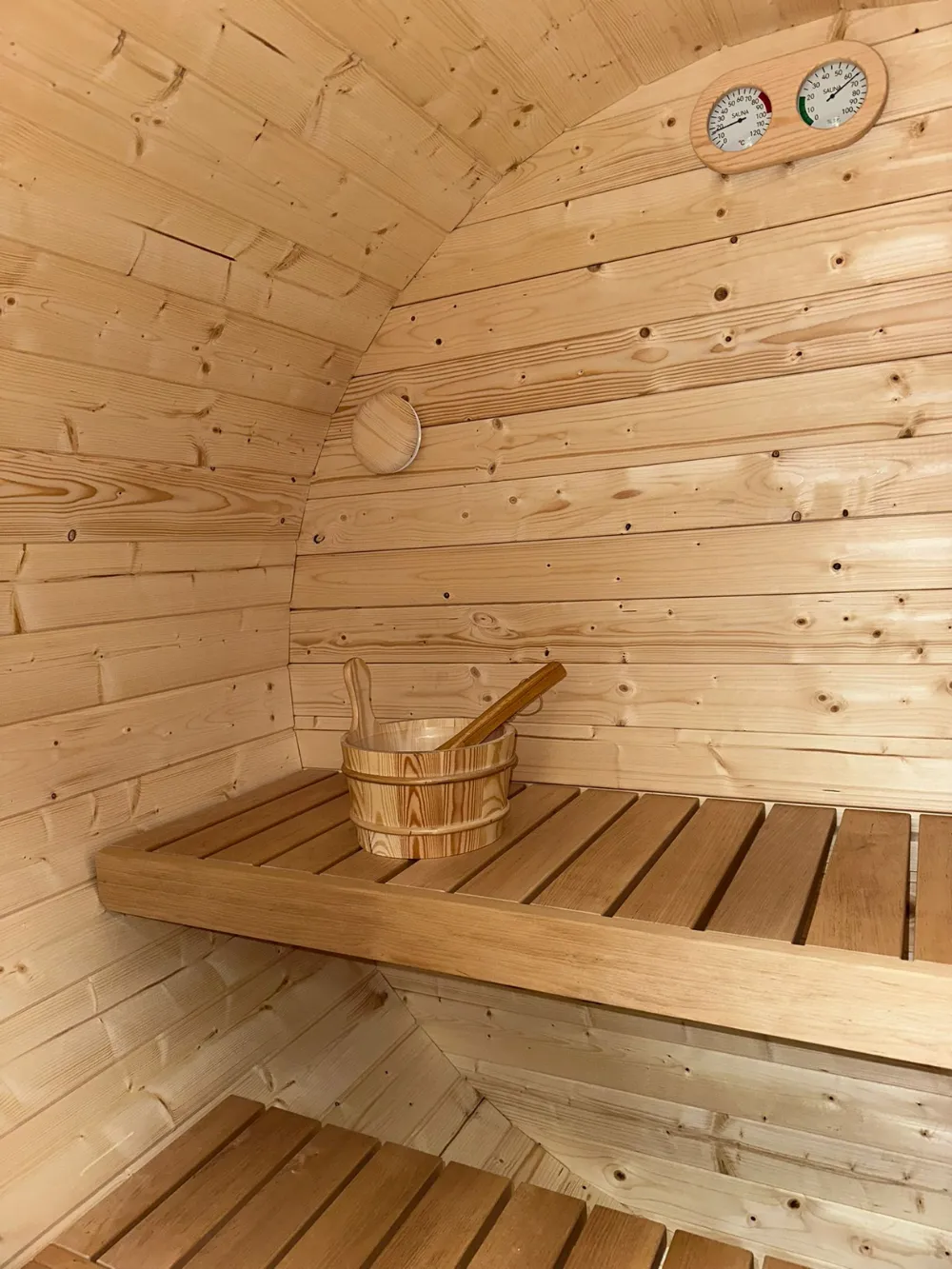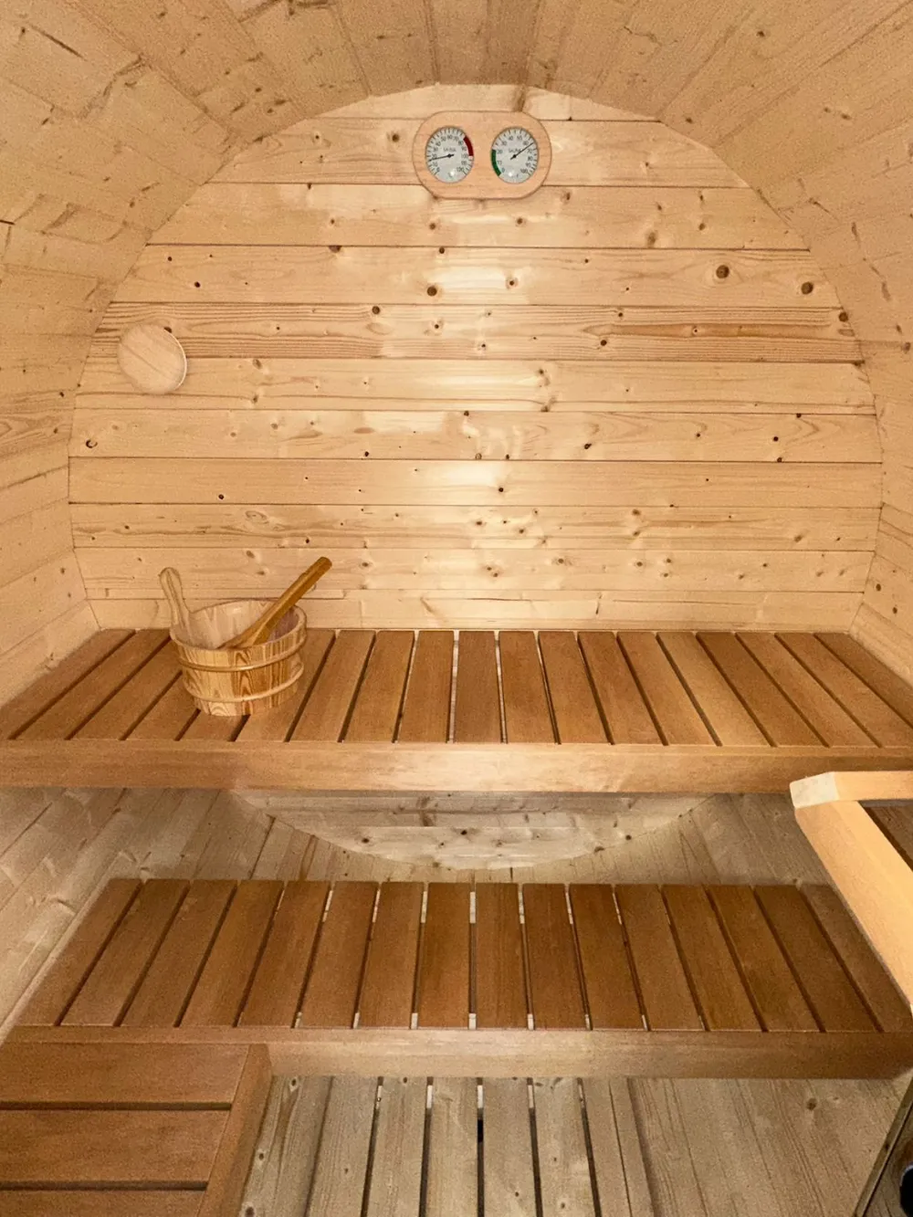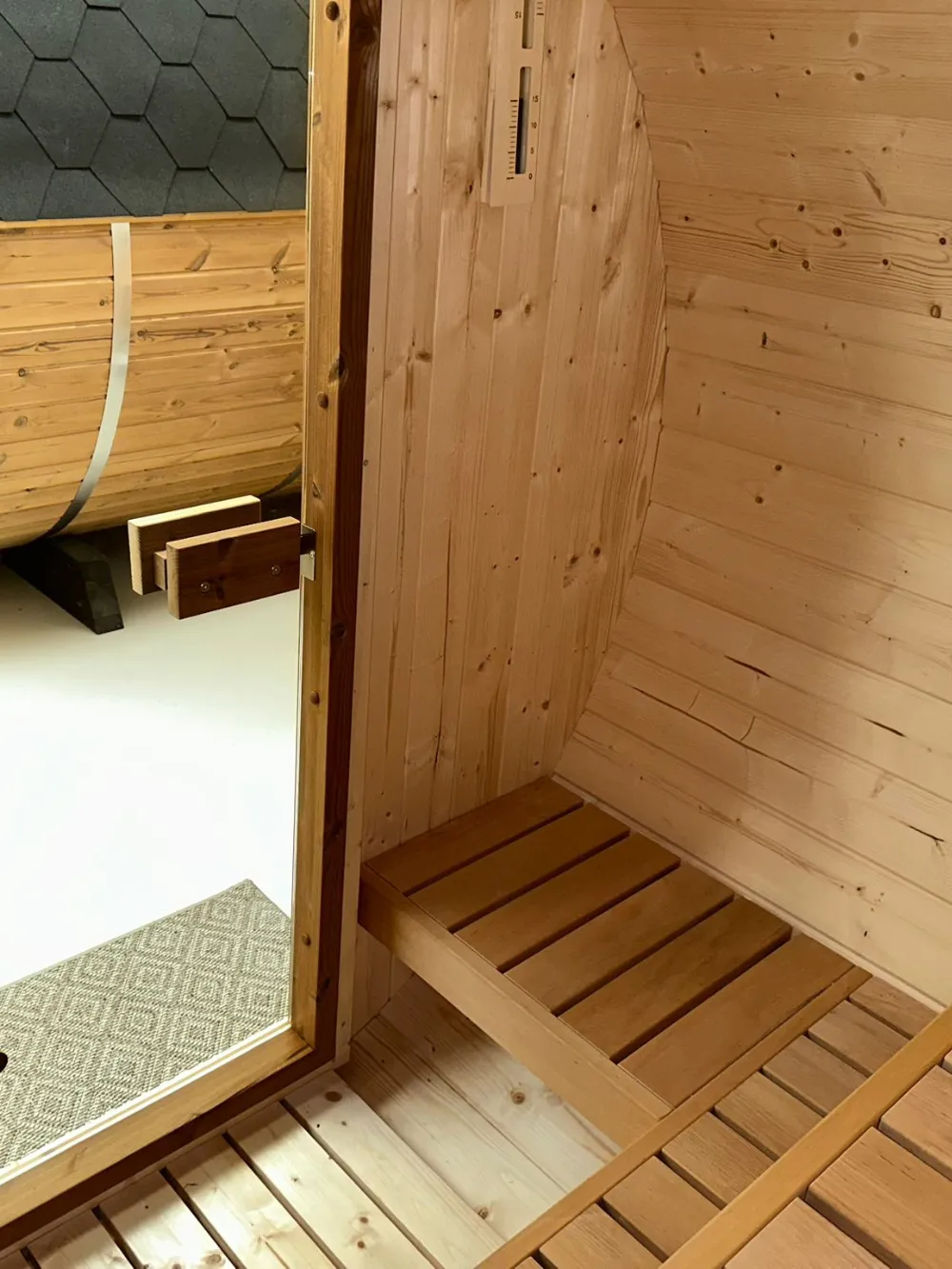 Our interior is crafted from knot-free hemlock spruce, chosen for its low resin content, smooth touch, and calm, scent-neutral character—perfect for relaxing heat sessions. The tight, uniform grain stays stable in high heat and humidity, resisting warping and splintering for long-term comfort. Its light tone brightens the cabin and cleans up easily, keeping the sauna feeling fresh and refined.