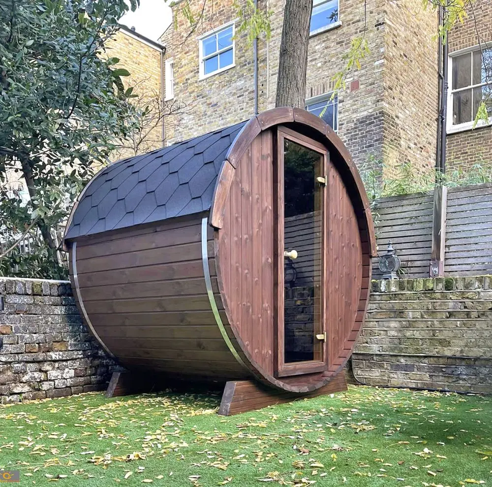 The Thermo Barrel 160 GD is a beautifully designed outdoor sauna that combines elegant craftsmanship with exceptional performance. Featuring a full glass door that floods the interior with natural light, it creates an inviting atmosphere while maintaining a sense of privacy. Inside, two levels of benches, made from high-quality thermoalder allows users to enjoy either a gentle or more intense heat experience. With its efficient barrel-shaped design that promotes even heat distribution and rapid warm-up times, the Thermo Barrel 160 GD offers the perfect balance of style, comfort, and relaxation — a luxurious wellness retreat for your garden.