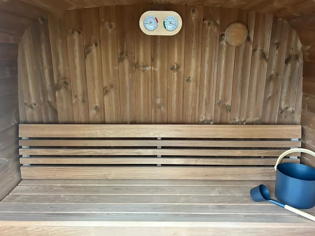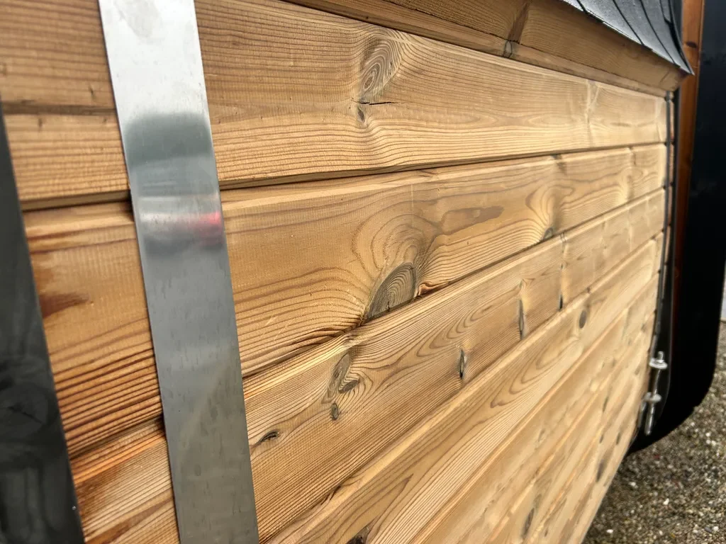 Thermowood is wood that has been treated at high temperatures (180–230°C). This process removes moisture and makes it naturally resistant to decay. We recommend treating the outside of the sauna with a wood preservative stain to keep it looking rich and new.