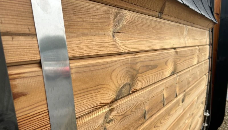Thermowood is wood that has been treated at high temperatures (180–230°C). This process removes moisture and makes it naturally resistant to decay. We recommend treating the outside of the sauna with a wood preservative stain to keep it looking rich and new.