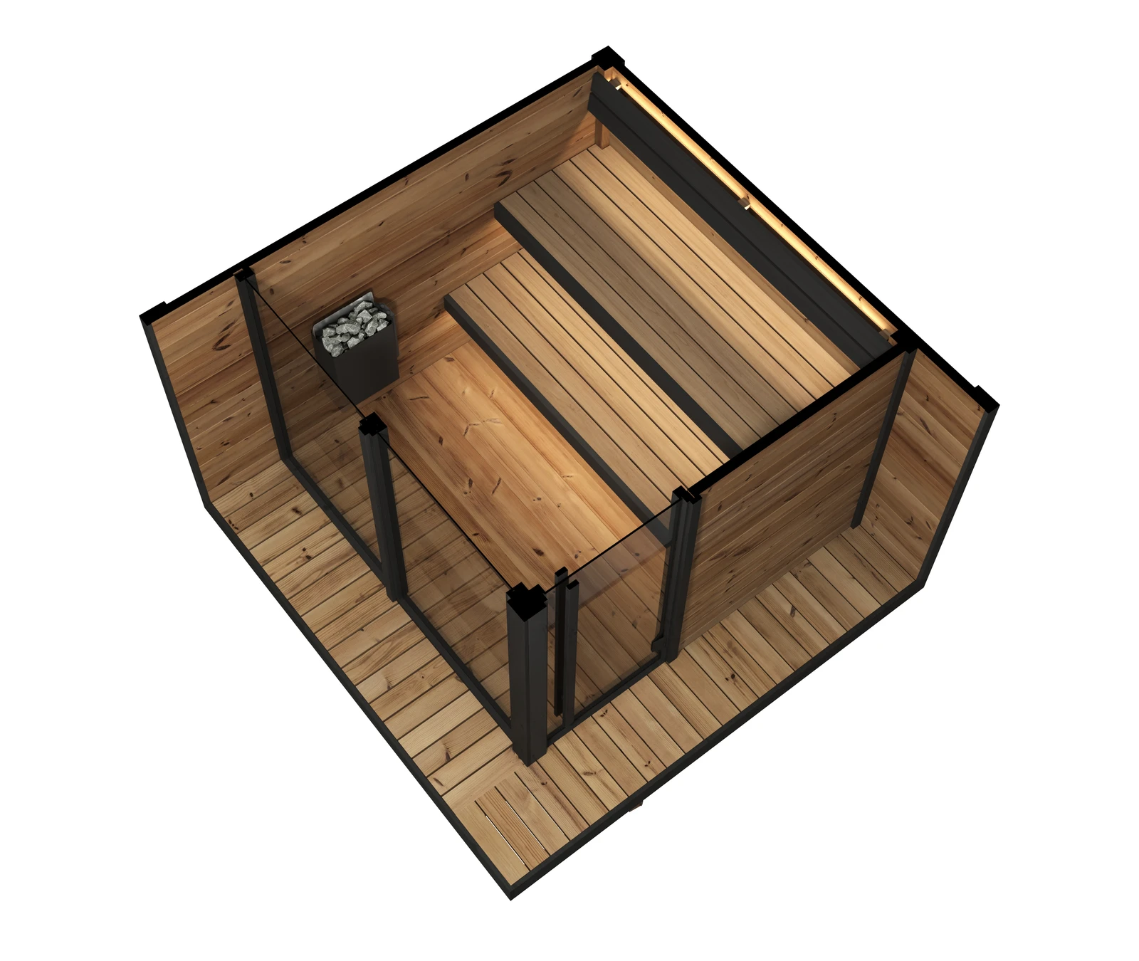 The Hiki sauna’s integrated ambient lighting creates a warm, soothing glow that enhances both relaxation and atmosphere. Soft LED strips are discreetly placed behind the benches, highlighting the natural texture of the Thermowood and adding depth to the interior. This subtle illumination mimics the calming warmth of a sunset, allowing you to unwind in a tranquil, spa-like environment.